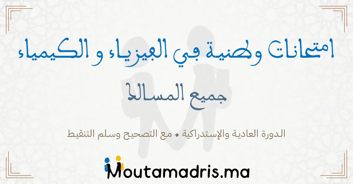 امتحانات وطنية مادة الفيزياء والكيمياء الثانية بكالوريا مع التصحيح يمكنكم تحميل ومشاركة موضوع امتحانات وطنية مادة الفيزياء والكيمياء الثانية بكالوريا مع التصحيح مع زملائكم، للمزيد من المواضيع التربوية، والدروس والجذاذات، والفروض والامتحانات المحلية والجهوية والوطنية مع التصحيح زوروا موقع متمدرس moutamadris او موقع المفيد