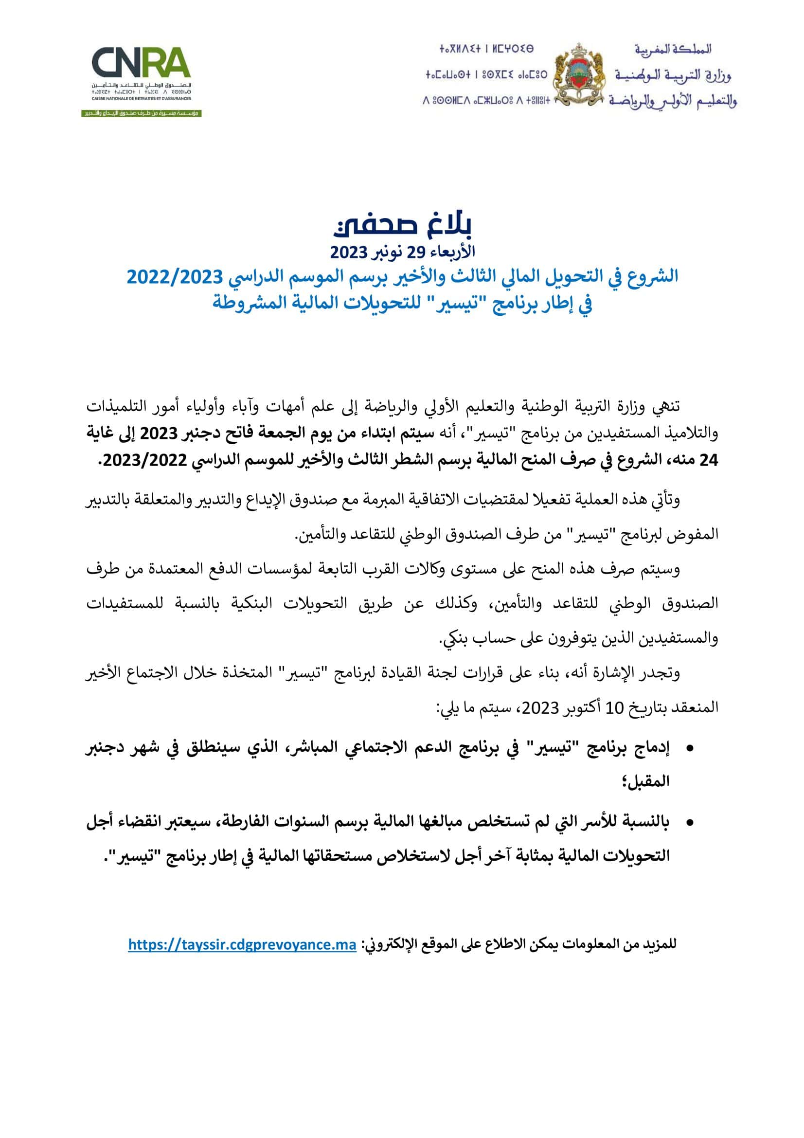 برنامج تيسير الشروع في التحويل المالي الثالث والأخير برسم الموسم الدراسي 2023/2024