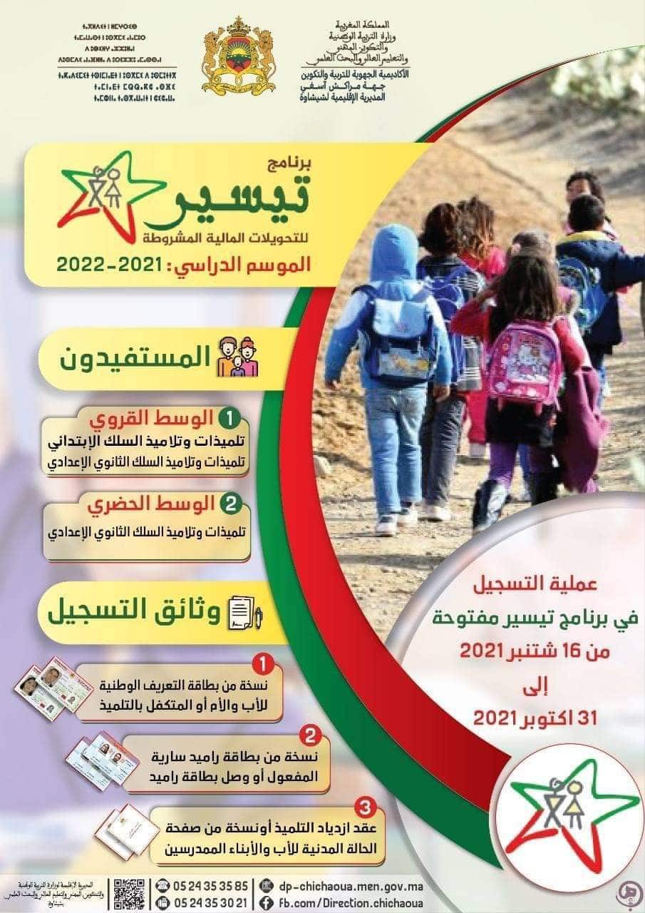 انطلقت عملية التسجيل للاستفادة من برنامج “تيسير” للتحويلات المالية المشروطة للأسر بجميع المؤسسات التعليمية على مستوى جهة الرباط سلا القنيطرة أولا ثم لجميع جهات المغرب وذلك وفق مقتضيات دليل مساطر المعتمد في البرنامج.