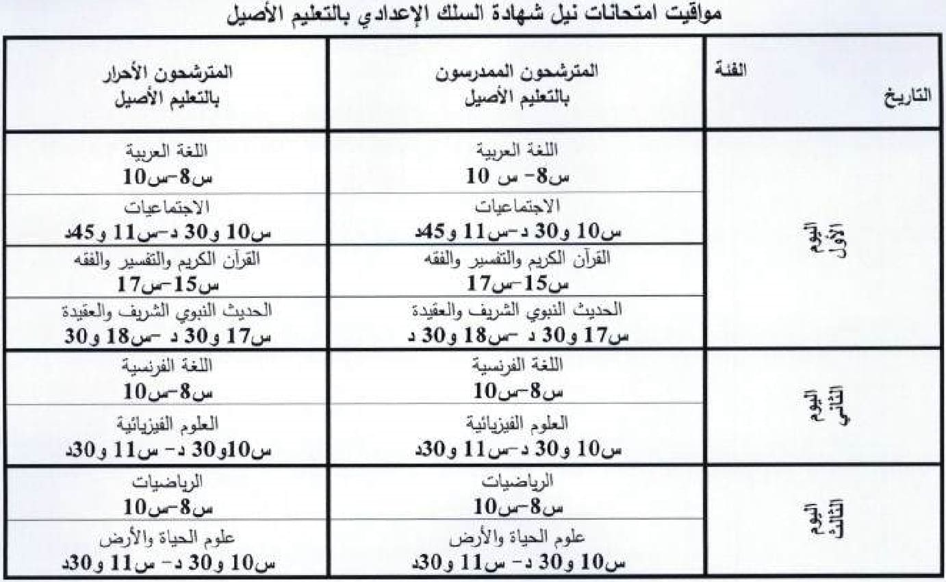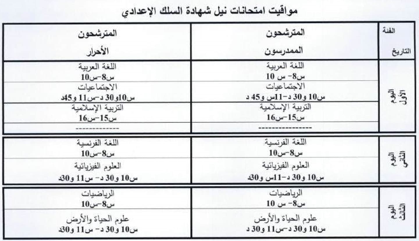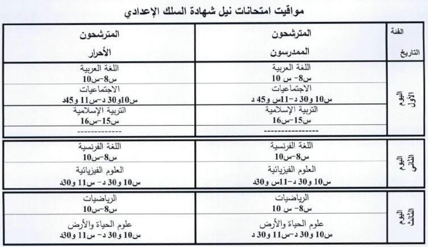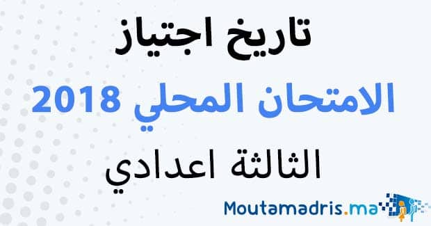 الامتحان المحلي الثالثة اعدادي 2018 سيجرى أيام 15 و 16 و 17 يناير 2018, حيث يجتاز المترشحين الممدرسون و الاحرار في اليوم الاأول امتحانات في اللغة العربية و الاجتماعيات و التربية الاسلامية و في اليوم الثاني امتحانات في اللغة الفرنسية و العلوم الفيزيائية و في اليوم الثالث امتحانات في الرياضيات و علوم الحياة و الارض.