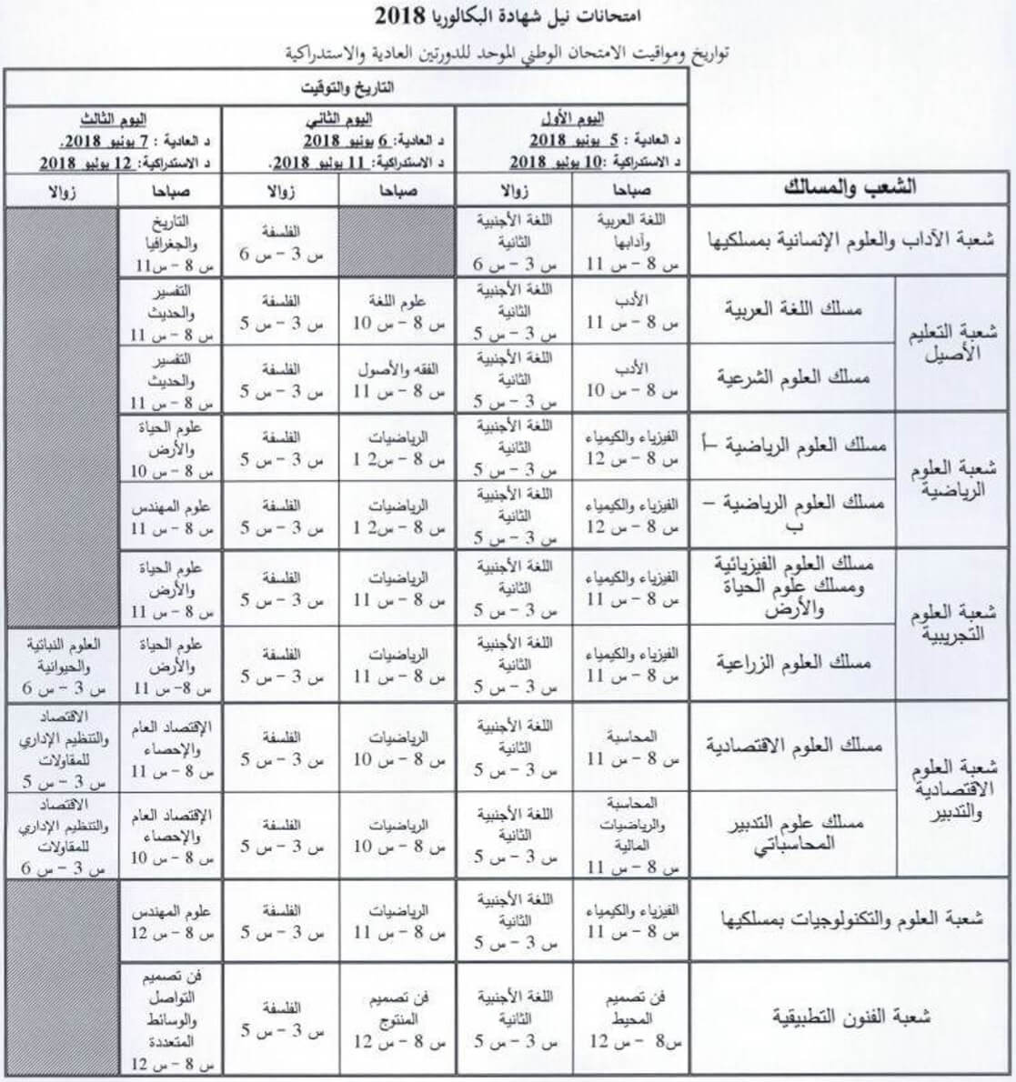 هذا وسيتم الإعلان عن نتائج الدورة العادية لامتحان شهادة البكالوريا يوم 22 يونيو 2018، ونتائج الدورة الاستدراكية من ذات الامتحان يوم 19 يوليوز 2018.