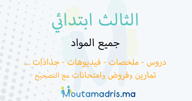 دروس ملخصات تمارين وامتحانات الثالث ابتدائي التربية الاسلامية الرياضيات النشاط العلمي اللغة الفرنسية اللغة العربية فروض الثالث ابتدائي مع التصحيح جذاذات – توازيع – استعمال الزمن – دلائل – روائز – تقاويم