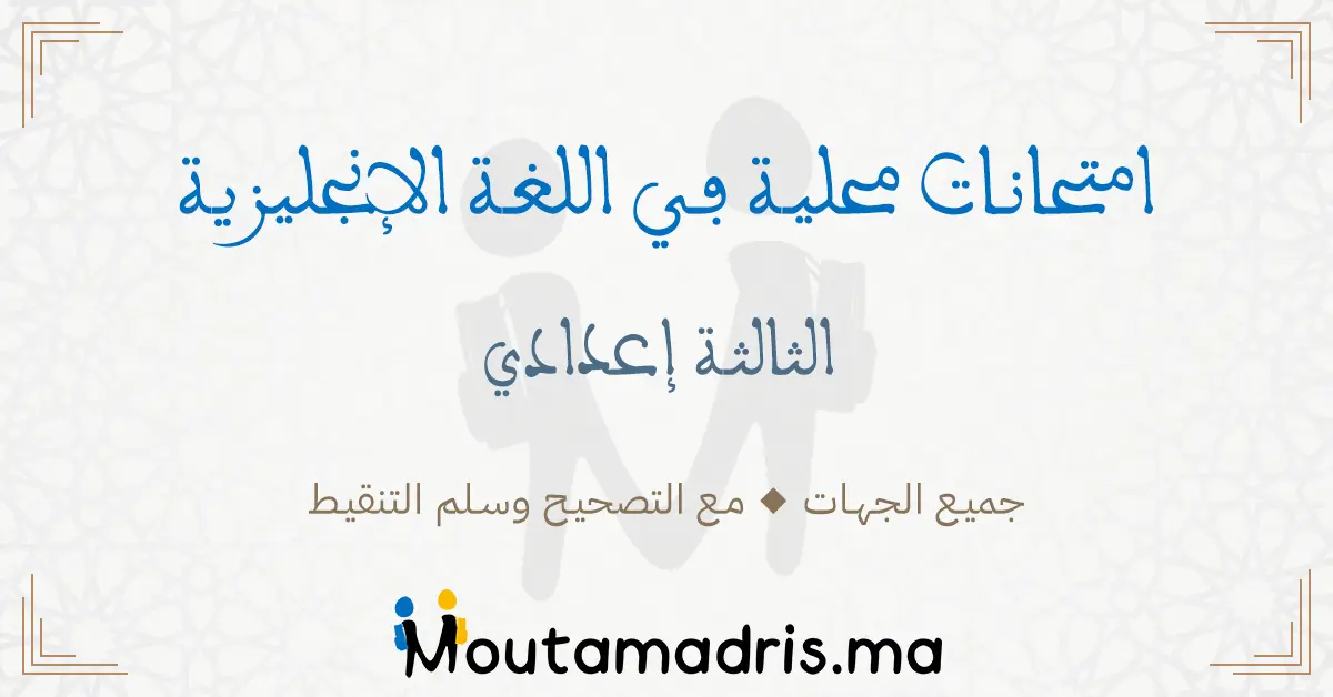 امتحانات محلية في اللغة الإنجليزية الثالثة اعدادي مع التصحيح جميع الجهات بالمغرب دورة يناير (الدورة الأولى), جميع نماذج الامتحان الموحد المحلي في مادة اللغة الإنجليزية للسنة الثالثة اعدادي مرفقة بعناصر الإجابة والتنقيط,و تجدر الإشارة إلى غياب بعض الملفات.