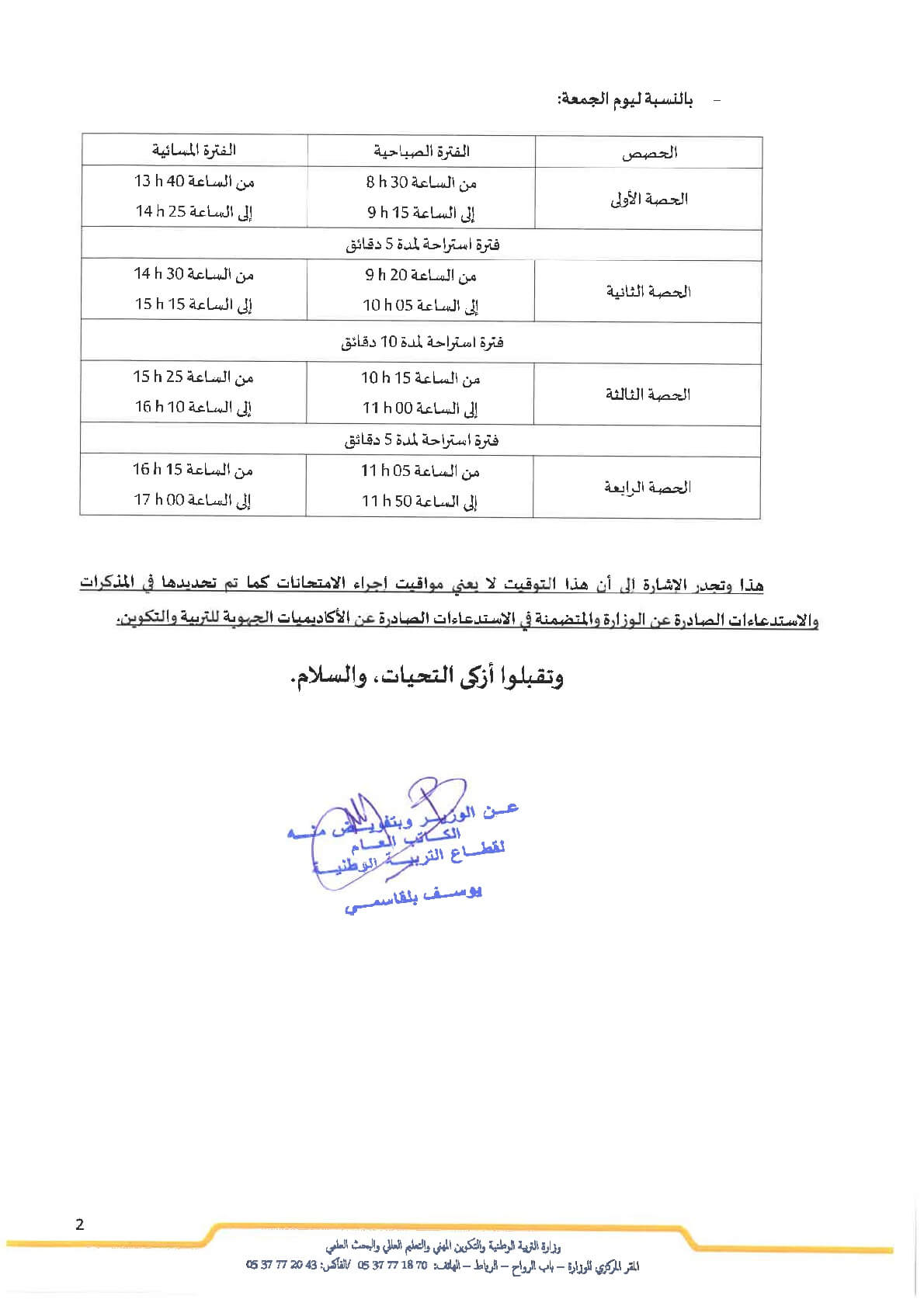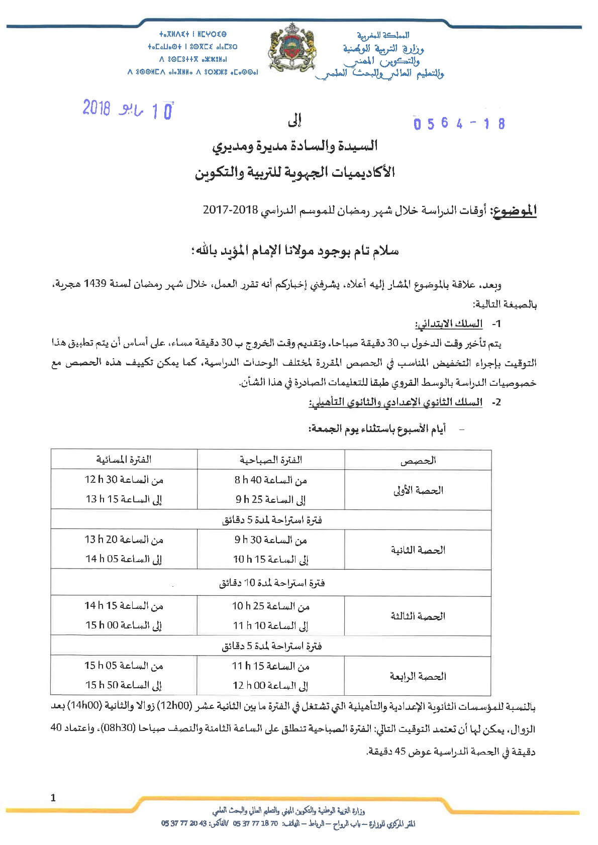 بلاغ من وزارة التربية الوطنية و التكوين المهني و البحث العلمي موجه الى المدراء و الاساتذة و التلاميذ بخصوص تغيير في توقيت الدراسة خلال شهر رمضان للموسم الدراسي 2017/2018 مذكرة رقم 18-0564 بتاريخ 11 مايو 2018.