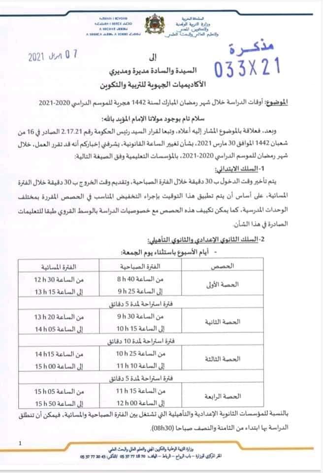 اوقات الدراسة في شهر رمضان 2021 بالمغرب يمكنكم تحميل ومشاركة موضوع اوقات الدراسة في شهر رمضان 2021 بالمغرب مع زملائكم
