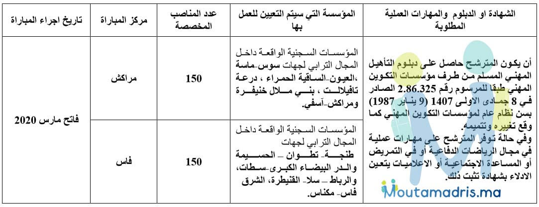 تنظم المندوبية العامة لإدارة السجون وإعادة الإدماج (DGAPR) مباراة لتوظيف 300 مراقب مربي. تحتفظ هذه المباراة بـ 25% من المناصب المتبارى في شأنها لمترشحي مكفولي الأمة، وقدماء العسكريين، وقدماء المحاربين، بالإضافة إلى الأشخاص المتمتعين بصفة مقاوم. سيتم تعيين المترشحين الناجحين للعمل بالمؤسسات السجنية التابعة للجهة المختارة من طرف المترشح، مع إمكانية إعادة توزيع المناصب حسب الخصاص الإداري. لا يُسمح للمترشحين الناجحين بتقديم طلب للانتقال إلا بعد انقضاء ثلاث سنوات من التعيين.