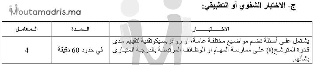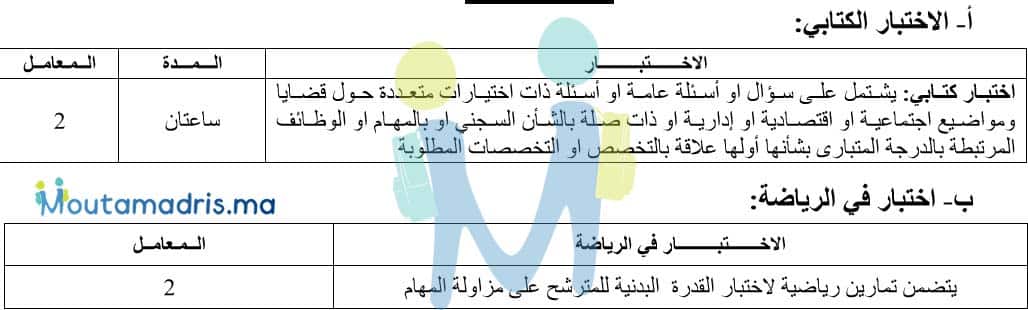 يتأهل لاجتياز الاختبار الشفوي أو التطبيقي الحاصلون على معدل 10/20 في الاختبار الكتابي واختبار الرياضة دون نقطة إقصائية (5/20). يتطلب هذا الاختبار استكمال الملف بالوثائق التالية: