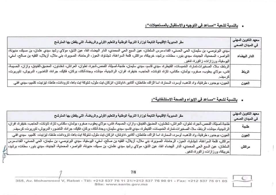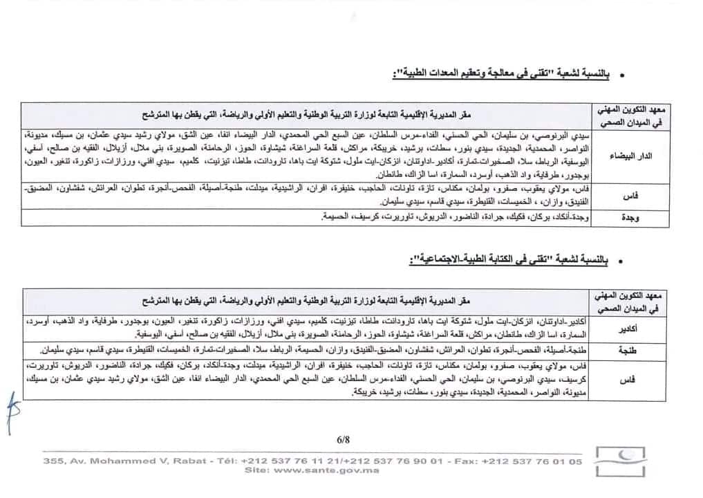 تعلن وزارة الصحة عن مباراة ولوج معاهد التكوين المهني في الميدان الصحي (IFPS) لشعبي النقل والإسعاف الصحي ومساعد في العلاج، متوفرة على 1035 منصب. تقع المعاهد في مدن أكادير، الدار البيضاء، الرباط، طنجة، العيون، فاس، مراكش ووجدة.
