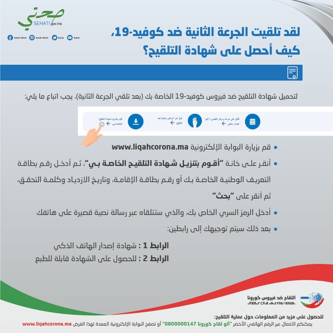 بعد الجرعة الثالثة يكون الشخص قد أتمم عملية التلقيح بشكل كامل، ويمكنه بعدها مباشرة تحميل شهادة التلقيح PDF jawaz tal9ih تثبت أنه استفاد من اللقاح، عبر نافذة « أقوم بتنزيل شهادة تلقيحي » على هذه البوابة الإلكترونية: