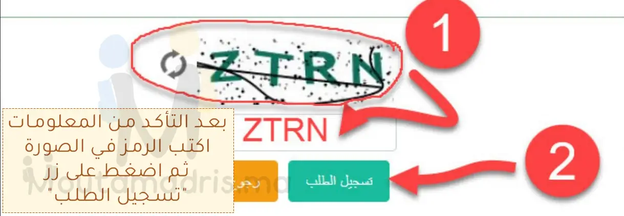 4- الضغط على “مواصلة تقديم طلب الحصول على منحة التعليم العالي” وادخال الرمز في الصورة والضغط على تسجيل الطلب.