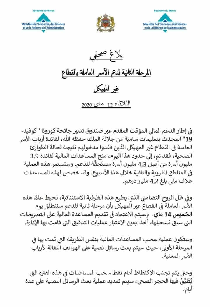 وفي ظل الروح التضامني الذي يطبع هذه الظرفية الاستثنائية، نحيط علمًا هذه الأسر العاملة في القطاع غير المهيكل بأن مرحلة ثانية للدعم ستنطلق يوم الخميس 14 ماي. وسيتم الاعتماد في تقديم المساعدة المالية على التصريحات التي سبق تسجيلها، أخذا بعين الاعتبار عمليات التدقيق التي قامت بها الإدارة.