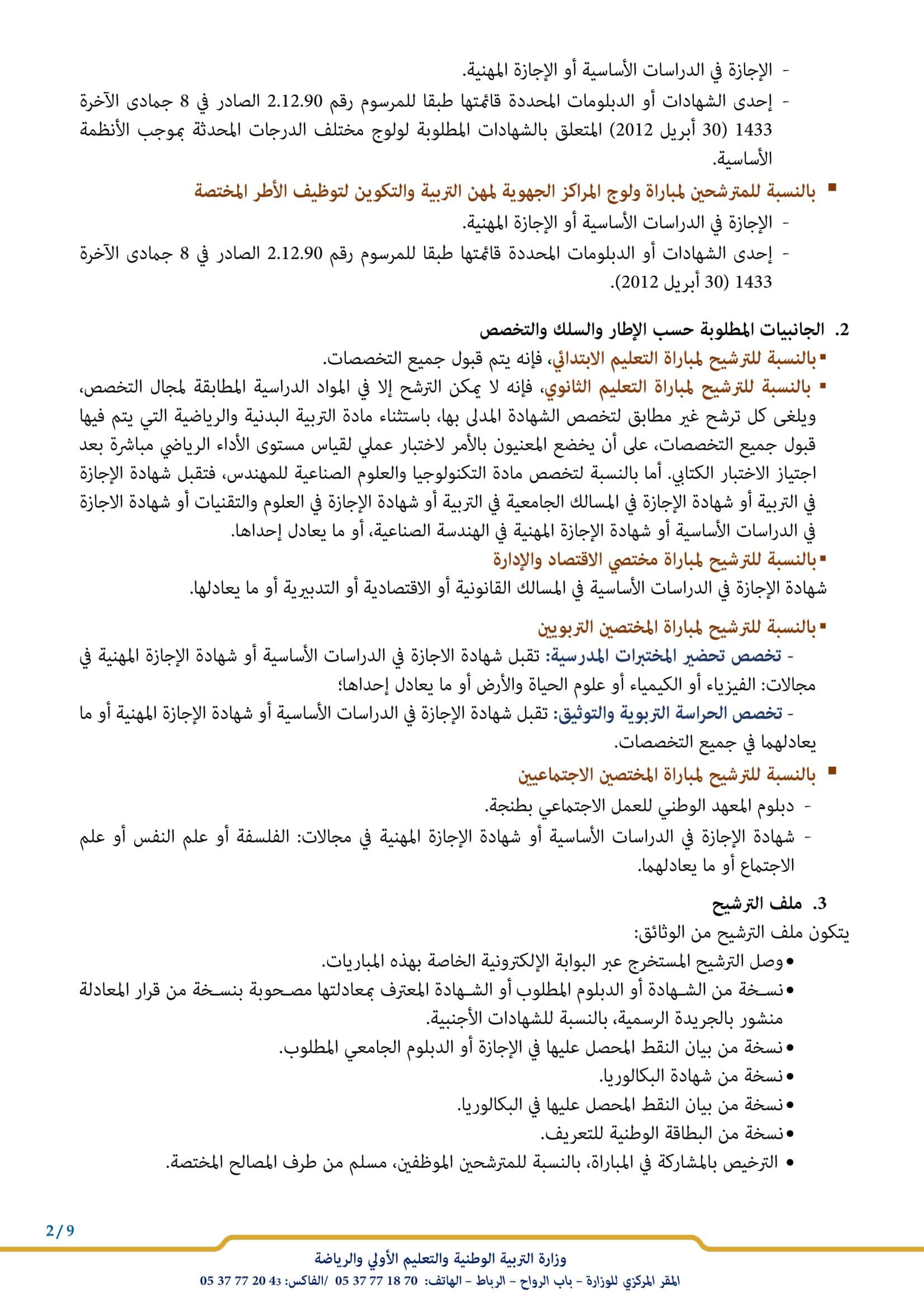 - بالنسبة للتدريس بالتعليم الثانوي بسلكيه: لا يمكن الترشج إلا في المواد الدراسية المطابقة لمجال التخصص، ويلغى كل ترشيح غير مطابق للتخصص الوارد في الشهادة المدلى بها، باستثناء مادة التربية البدنية والرياضية التي يتم فيها قبول جميع التخصصات.