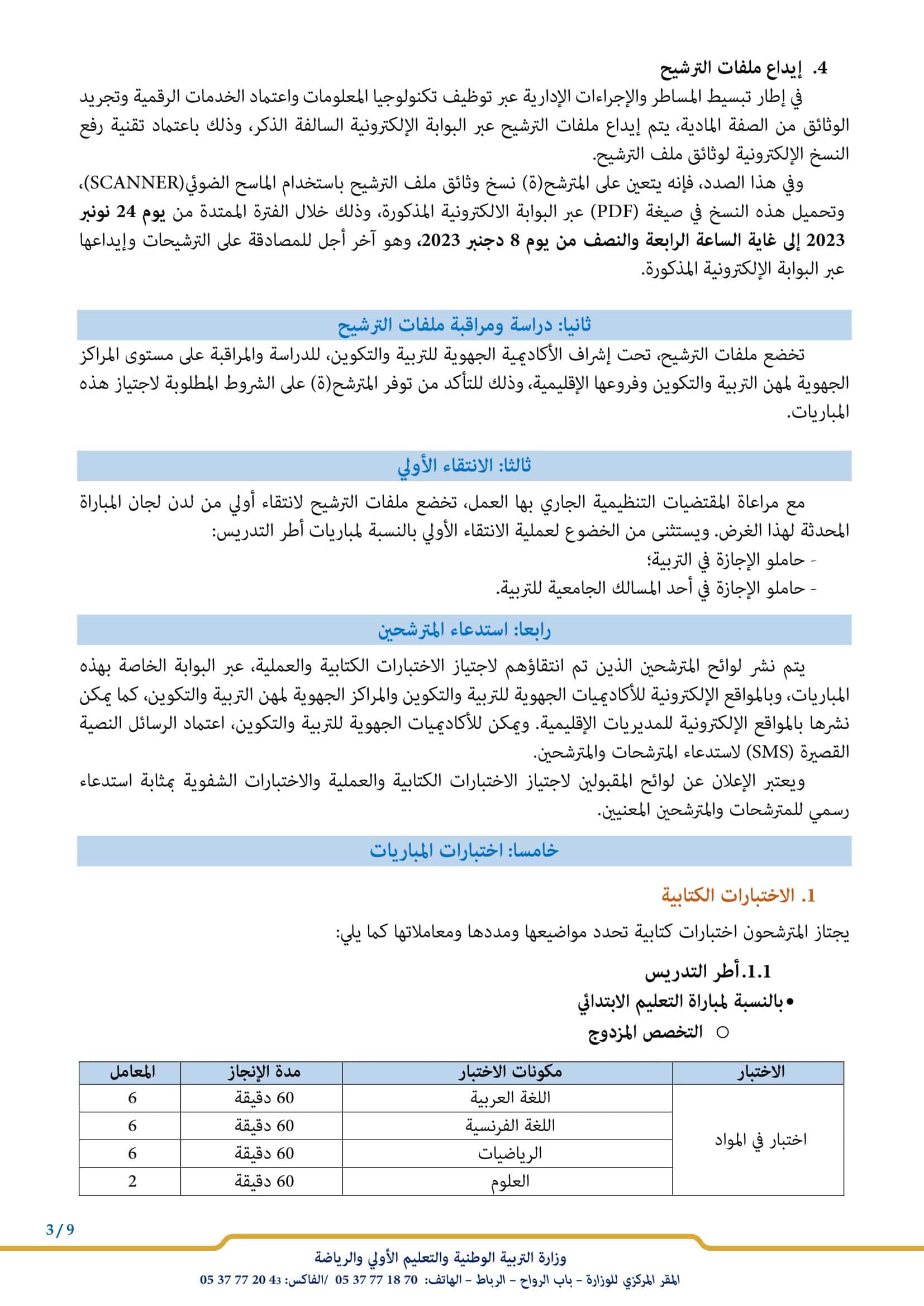 هذا، وفور نشر الإعلان عن المباراة، سيكون على المسجلين المصادقة على الترشيح الإلكتروني وإيداع ملفات الترشيح بالمديريات الإقليمية التي يرغبون العمل بها، وذلك داخل الآجال التي ستحدد في الإعلان.